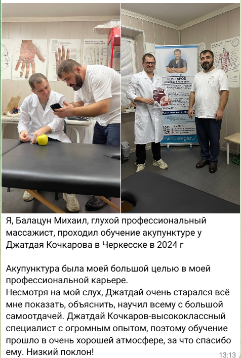 Доктор Кочкаров Д.Б имеет 25-летний опыт работы в области массажа, мануальной терапии, акупунктуры, китайских трав и гомеопатии, иглоукалывания, акупунктуры и гирудотерапии, а также хиджамы. Он является действующим врачом и членом Международного регистра специалистов, соучредителем Ассоциации хаджамов и массажистов КЧР и России, а также ведёт успешную частную практику в своей частной клинике в г. Черкесске, а также в городах СКО, России.